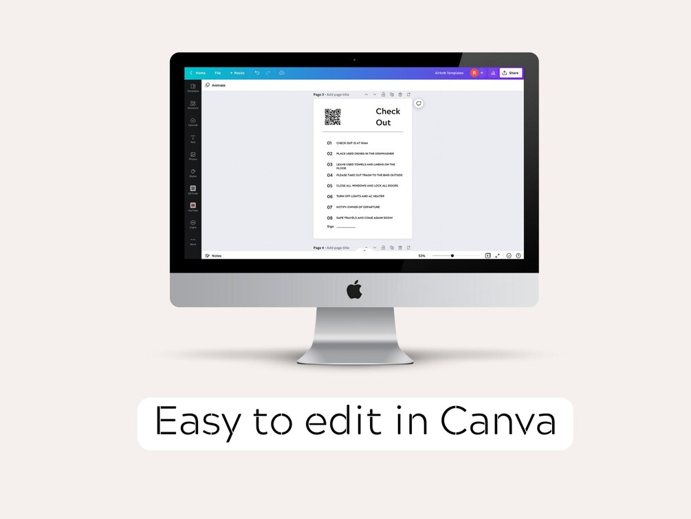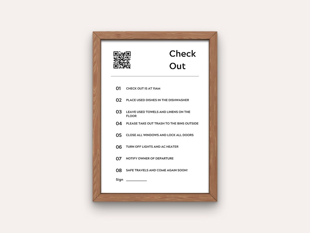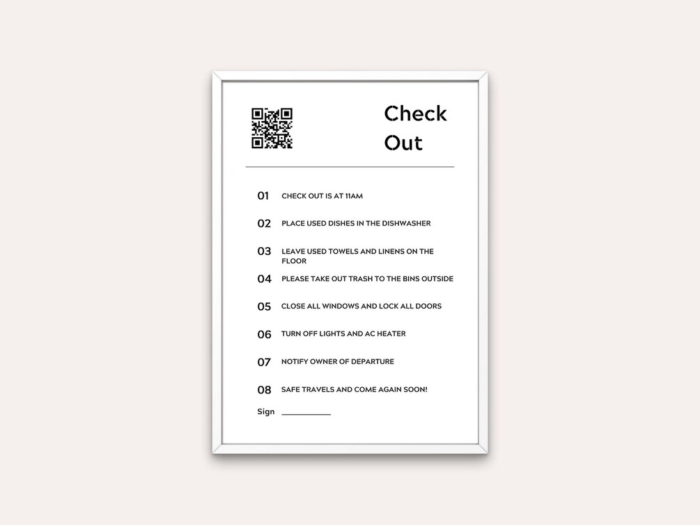 Airbnb Check Out Sign With QR Code. You can edit this QR code on Canva and replace with your website scan-able code.