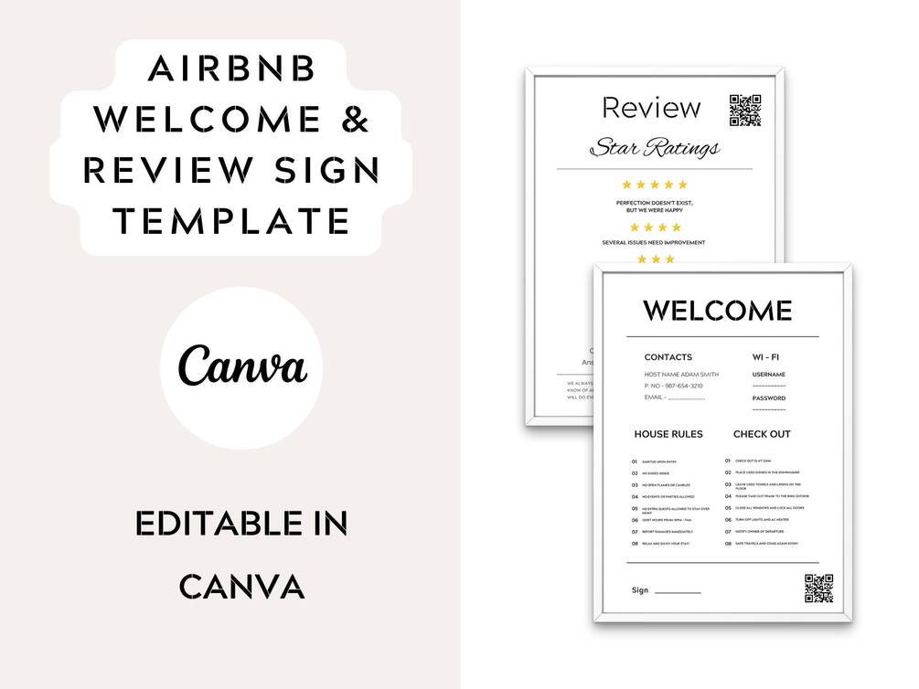 Editable Airbnb Signs 2 in 1 Template, Airbnb Welcome Sign and Review Rating Sign, VRBO Vacation Rental, Editable in Canva