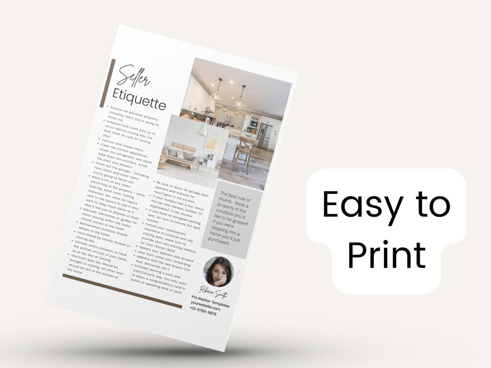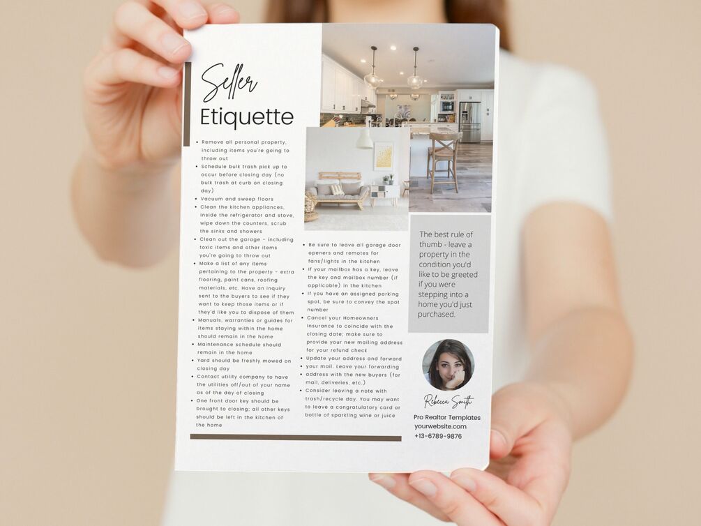 Real Estate Seller Etiquette Flyer, Real estate marketing, Real estate seller guide, closing guide, Canva Editable| Real Estate Canva Template | Real Estate Printable template.